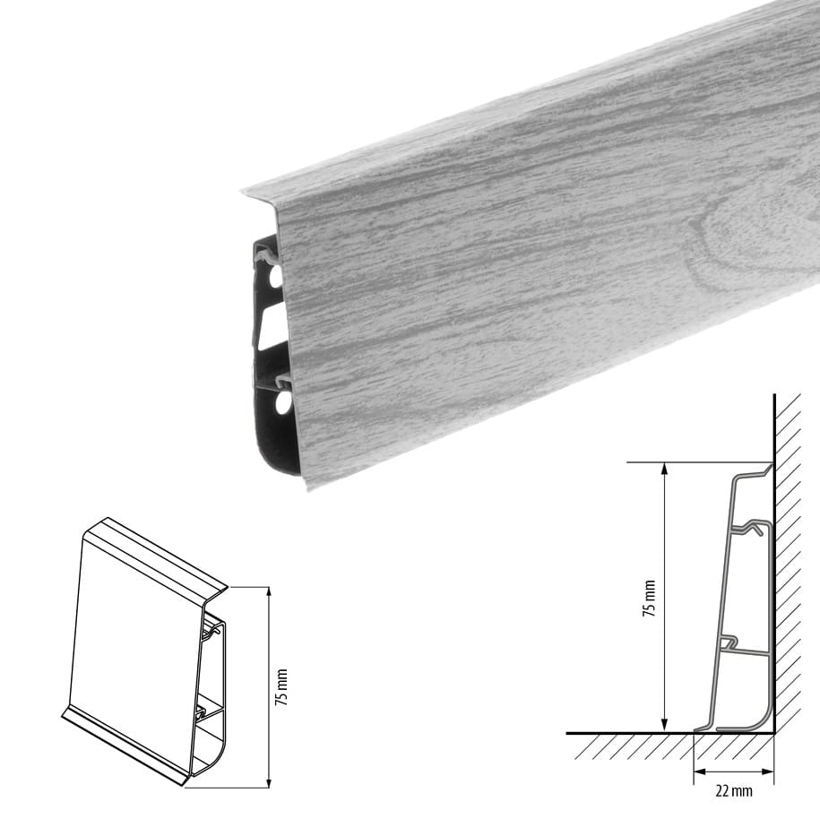Заказывайте качественный напольный плинтус из ПВХ Cezar Дуб серый светлый матовый 75 мм с доставкой по Минску и Беларуси. В наличии аксессуары (заглушки, уголки).