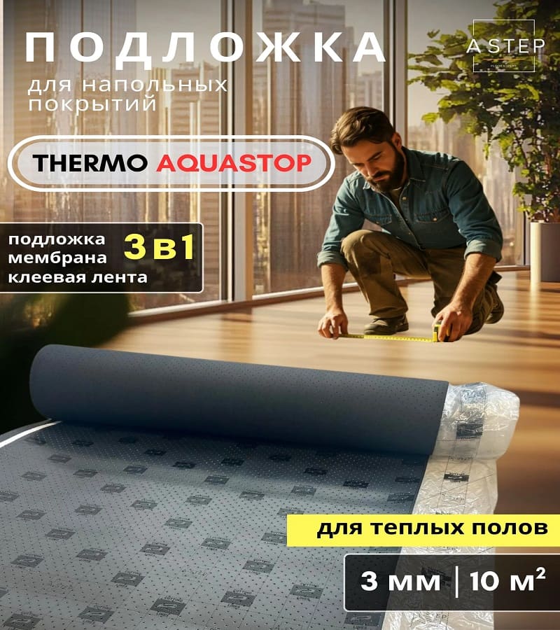 Подложка Thermo Aquastop с интегрированной пленкой — это инновационное решение для укладки пола, которое обеспечивает комфорт и защиту. Разработана специально для теплых полов.