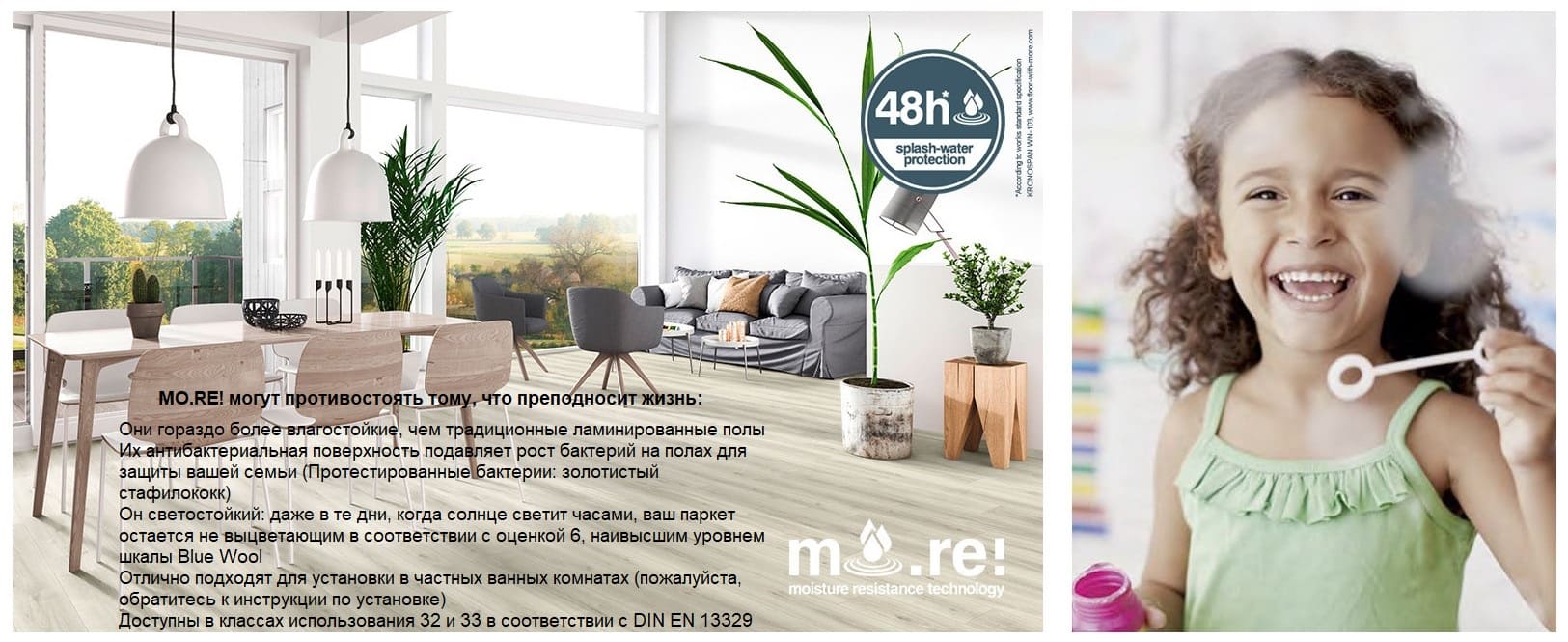 Водостойкость: MO.RE! Moisture Resistance от KRONOSPAN (водостойкость ламината до 48 часов).