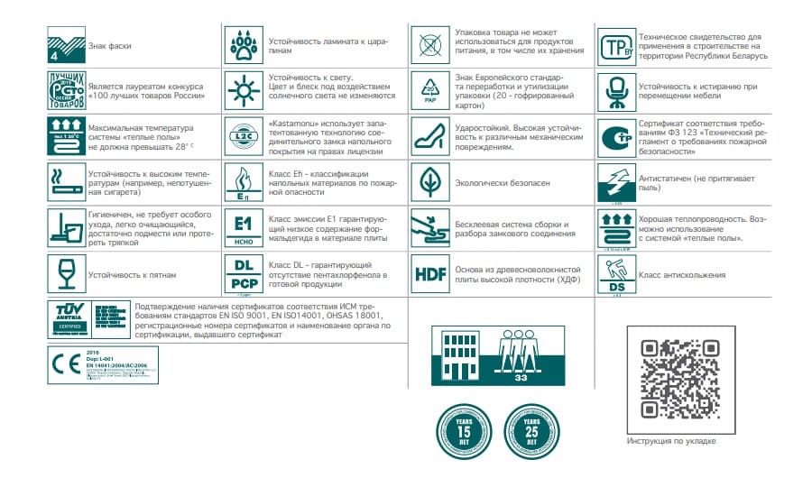 Коллекцию "Эмеральд" изготавливают на новом инновационном оборудовании по бельгийской технологии. Замковое соединение UniClic (патент компании Unilin Бельгия) покрыто воском, такой пол легко укладывать. Сверхплотная влагостойкая древесноволокнистая плита HDF имеет плотность 970 кг/м³, что позволяет ламинированным полам Kastamonu быть водостойкими более суток. Такое надежное напольное покрытие 33 класса толщиной 12 мм будет служить в квартире или доме больше 25 лет. Матовый защитный слой AC5 с выраженной древесной структурой в коллекции Emerald имеет визуальную и тактильную схожесть с натуральным деревом.