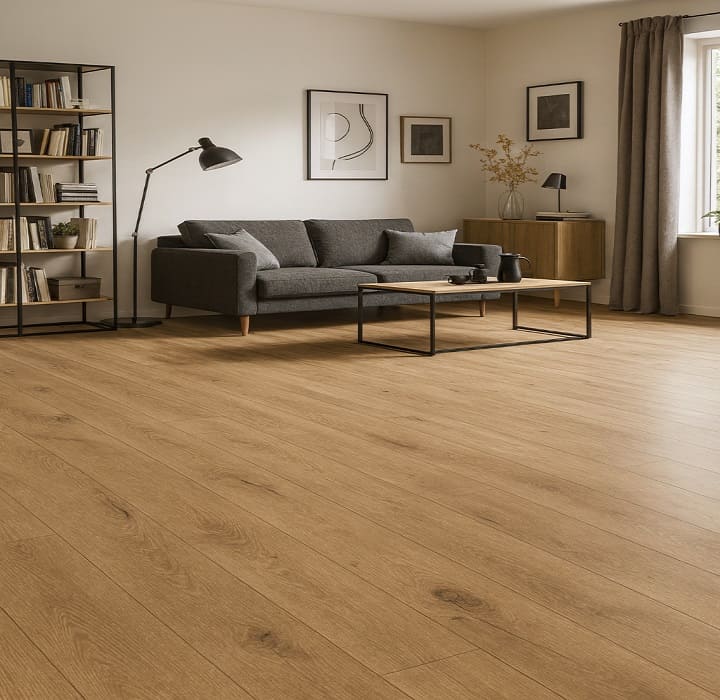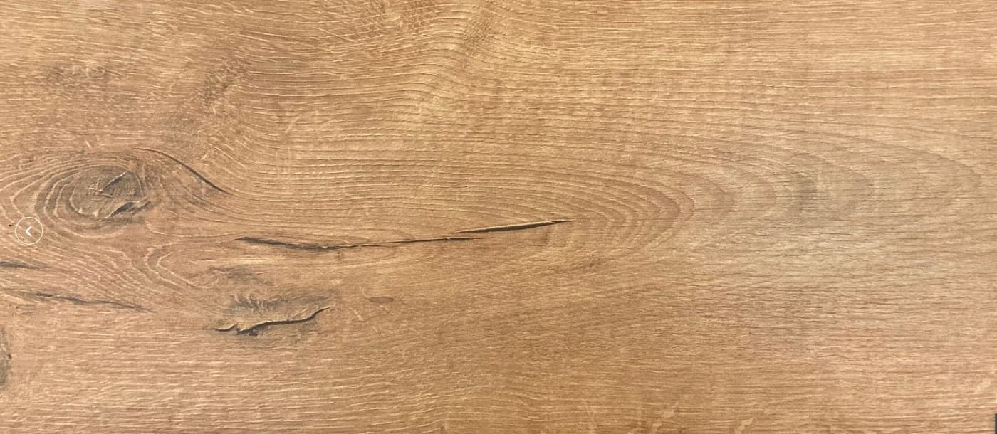 - Эффект массивной широкой доски: Однополосный декор «Дуб Ливиньо» в широком формате (242 мм) с выразительной V-образной фаской по периметру создает на полу роскошный и максимально натуральный вид цельной деревянной доски.