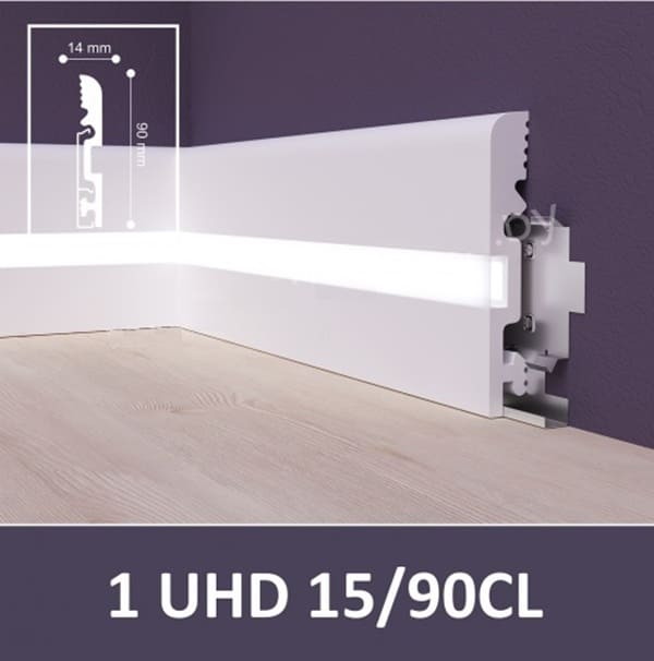 В нашем магазине в Минске вы купите белый напольный плинтус из дюрополимера под LED освещение 1 UHD 15/90CL (c LED рассеивателем) производства Solid по цене дилера с доставкой по Беларуси. Практичный, надежный профиль для пола изготовлен из полимера ультравысокой плотности (дюрополимера), поэтому не боится воды, ударов. Он абсолютно безопасен для здоровья и легко моется. Плинтус можно красить в любой цвет.