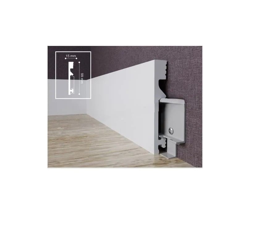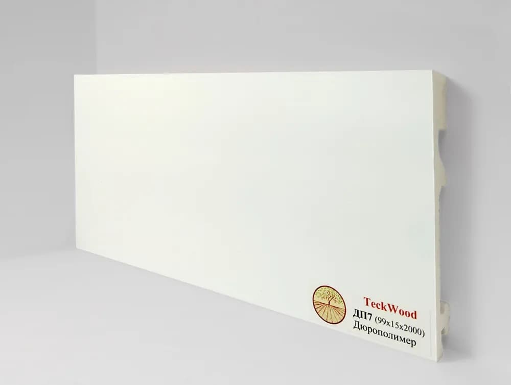 В нашем магазине в Минске вы можете посмотреть образец и заказать напольный плинтус из дюрополимера TeckWood Белый ДП7 высотой 99 мм с креплением на клипсу по цене дилера со скидкой на объеме.
