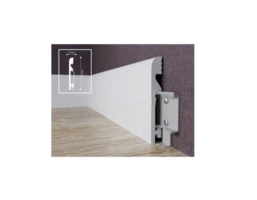 В нашем магазине в Минске вы можете посмотреть образец и заказать напольный плинтус из дюрополимера TeckWood Белый ДП8 высотой 100 мм с креплением на клипсу по цене дилера со скидкой на объеме.
