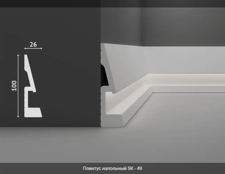 В нашем магазине в Минске вы купите белый напольный плинтус с подсветкой из дюрополимера SK-49 100x26x2000 мм по цене дилера с доставкой по Беларуси. Практичный, надежный профиль для пола изготовлен из полистирола ультравысокой плотности (дюрополимера HDPS Polymer), поэтому он не боится воды, ударов, не деформируется, не подвержен гниению и образованию грибка. Планка легко окрашивается и перекрашивается в любой цвет. Плинтус напольный из дюрополимера SK 49 загрунтован и окрашен двухкомпонентным полиуретановым грунтом на водной основе.